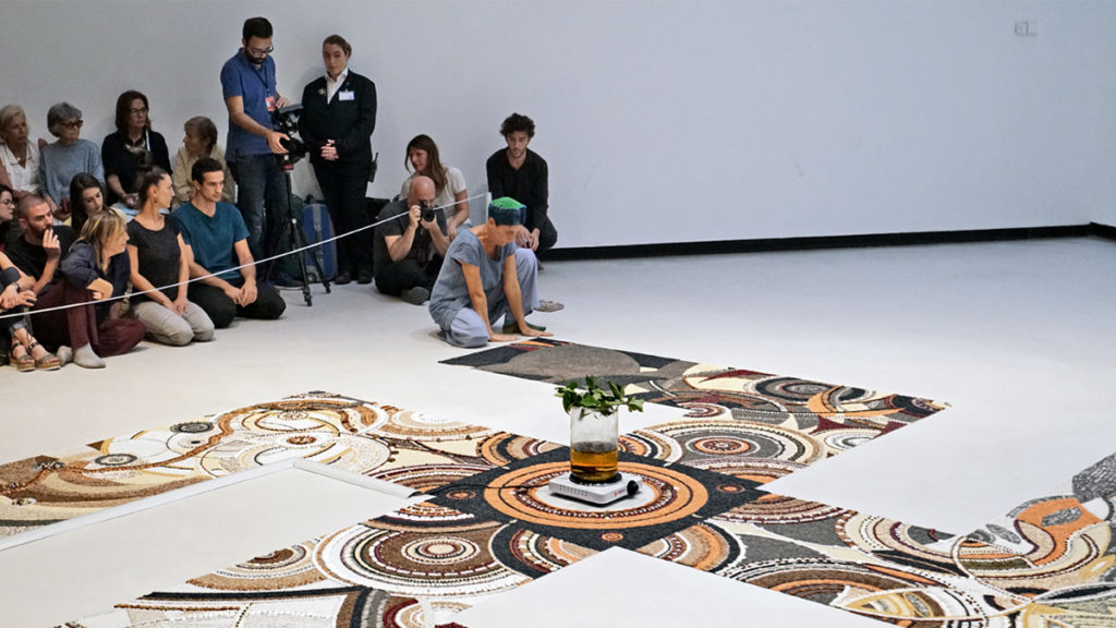 After the first exhibition, which was organised for the Prize, the artwork was displayed another three times in 2001, both in Italy and in Belgium. This year’s installation at the MAXXI is just as accurate, although with a different, more complex ornamental design, every aspect of which has been documented by the museum. The event is also an opportunity to present the publication containing the said documents as well as the experiences of the people involved in the installation process.