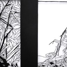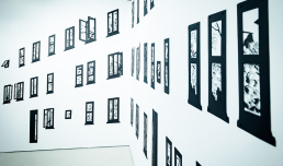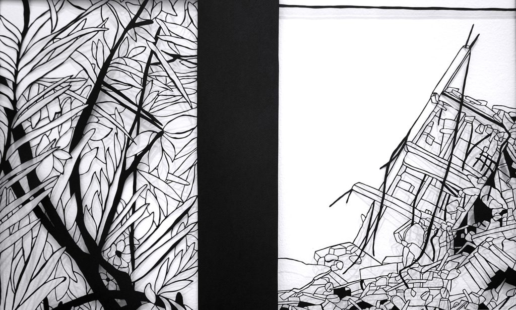 Where We Stand, the installation featured in the exhibition, consists of cut-out paper windows that frame an amalgam of heterogeneous images evoking at one moment a natural landscape, at another a landscape of destruction and conflict. Together with the optical illusion created by the windows, this leads us to continuously probe our reading of the work and the perspective relationships between the elements composing it.