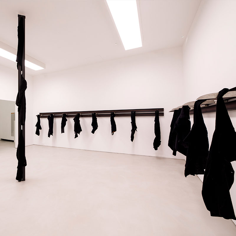 The installation on show, Untitled, presented for the first time in Todi and then in London in 2014, is one of the last created by the artist. Enveloping the space, «tracks» made of iron beams are arranged on four walls. Large butcher knives with handles wrapped in newspaper poke out from the beams and black coats reduced to shreds, in turns, hang out at the end of the blades. In the centre of the space a single «column» raises other coat flaps. The work refers to several previous installations by Kounellis – such as the series of lit gas beaks arranged on a wall (Paris, 1969) or the slaughtered meat hanging on iron plates (Barcelona, 1989) – and stands as an extreme, pessimistic meditation on the dialectical clash between historical forces and individual destiny, between violence and collective redemption. In a note from 1982, Kounellis wrote: «I seek […] dispersed history in (emotional and formal) fragments. I am dramatically looking for unity, even if hard to grasp, albeit utopian, albeit impossible and, for that reason dramatic».