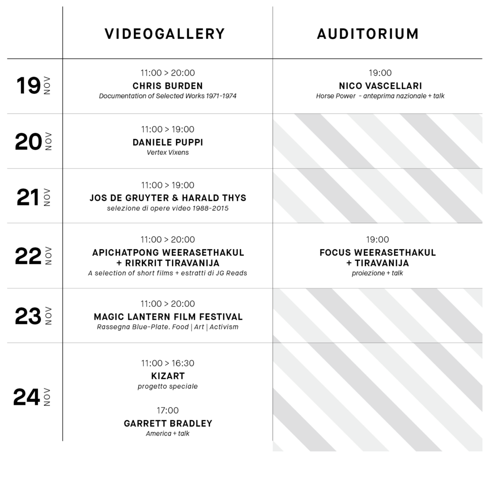 Returning to MAXXI for a second edition, Videoart Week presents a full week devoted entire to Italian and international video art. From the Magic Lantern Film Festival to Kizart, the programme devoted to the youngest audience, from the works of Garrett Bradley, Chris Burden, Jos de Gruyter & Harald Thys, Rirkrit Tiravanija and Apichatpong Weerasethakul to the Italians Nico Vascellari and Daniele Puppi.