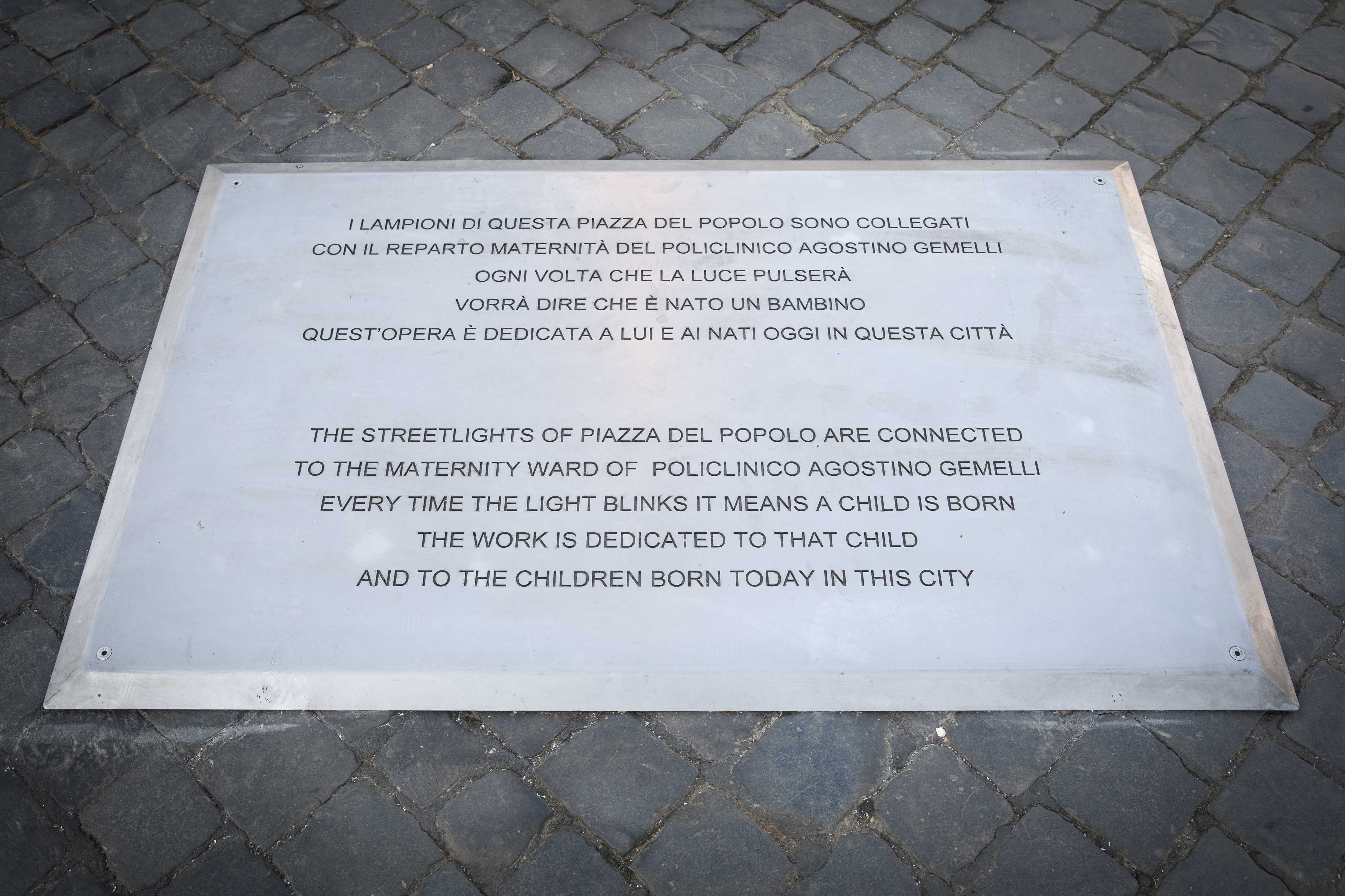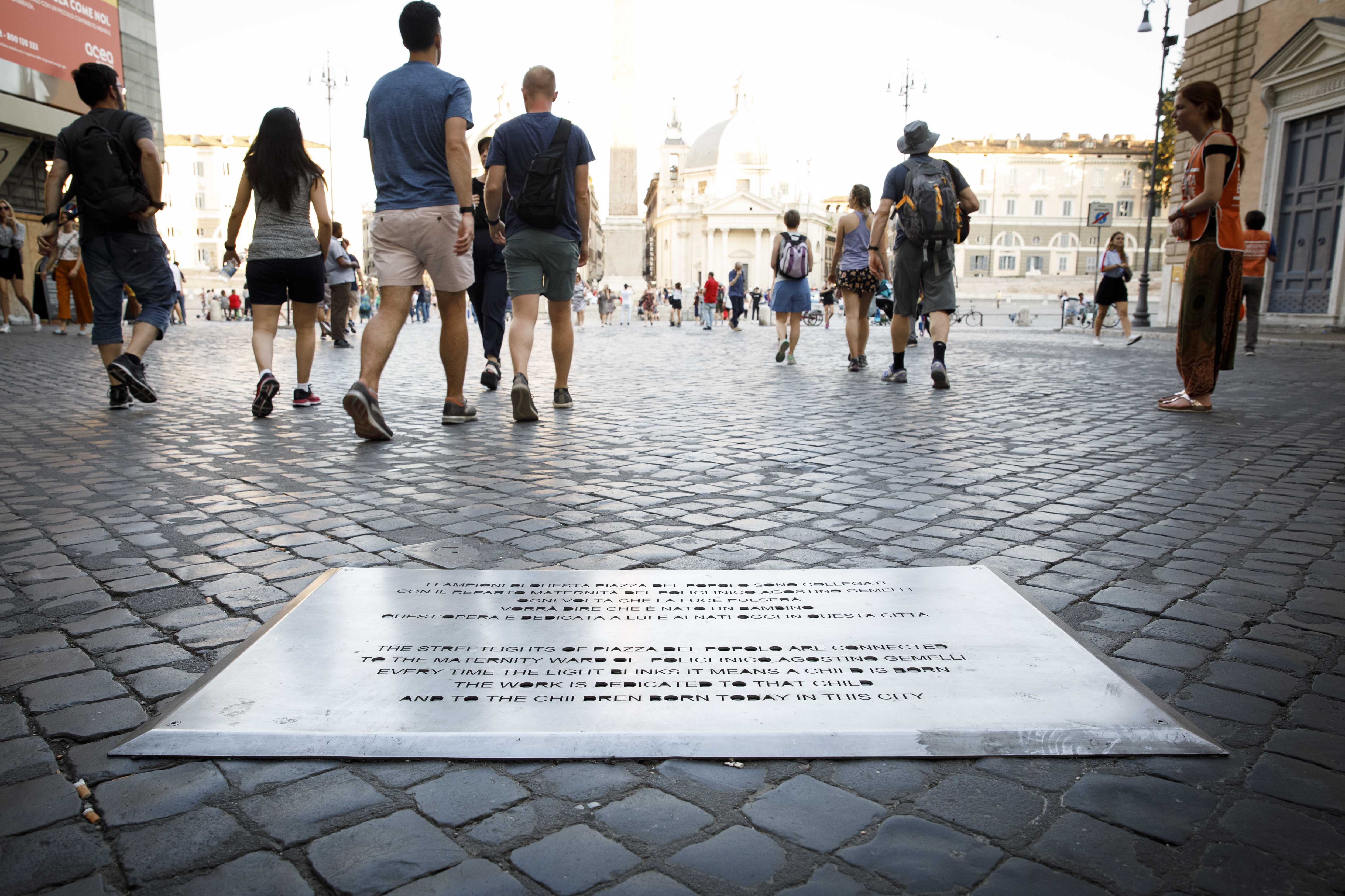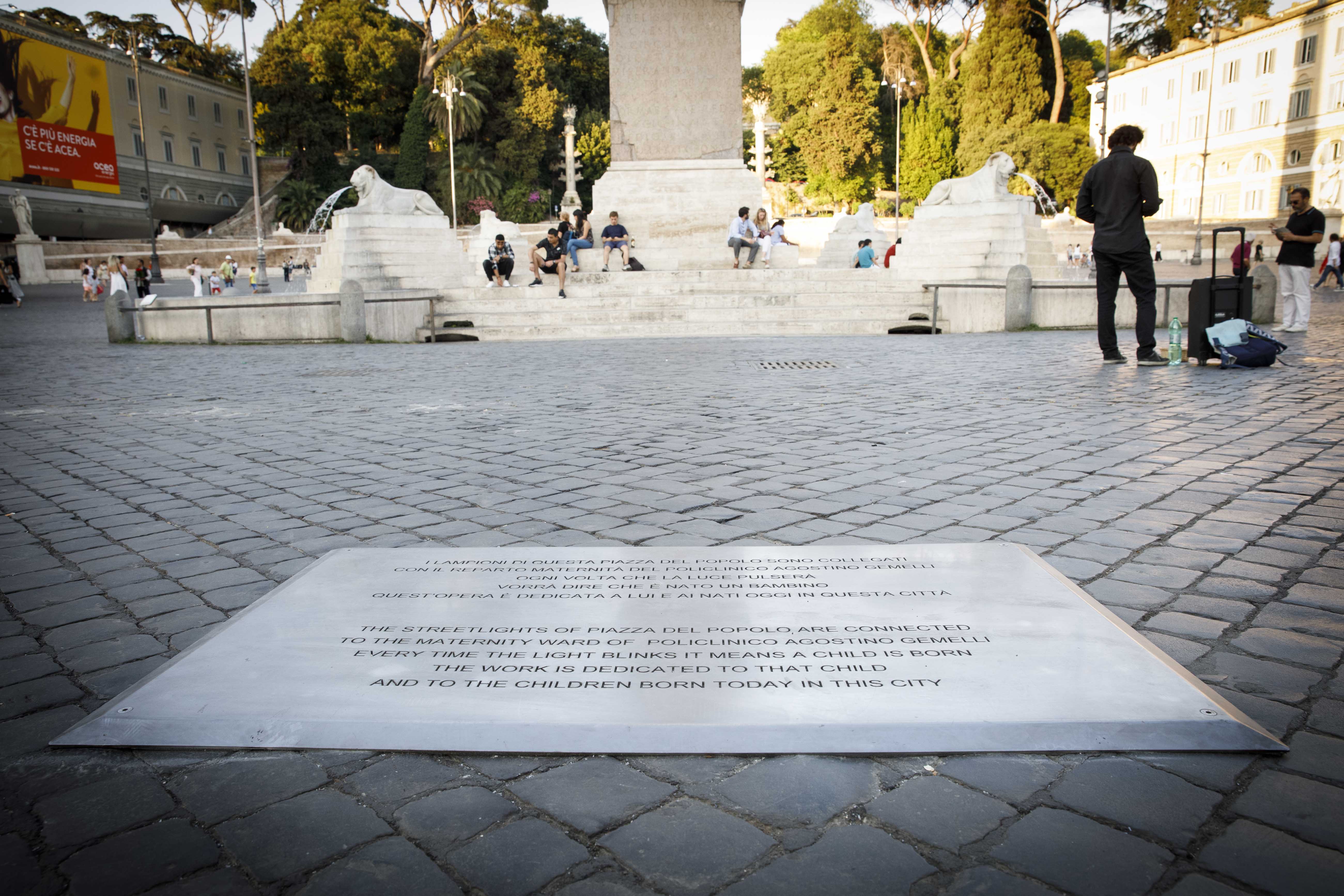 L’ambizioso progetto di Alberto Garutti collega i lampioni della piazza con il reparto di maternità del Policlinico Agostino Gemelli IRCCS. Ogni volta che la luce pulserà, vorrà dire che è nato un bambino: l’opera è dedicata a lui e a tutti coloro che in quel giorno nasceranno in città. Garutti, esponente rilevante dell’arte pubblica, sviluppa la sua ricerca a partire da opere che escono dallo spazio del museo per inserirsi nel contesto urbano e creare un coinvolgimento del pubblico mirato alla condivisione totale del messaggio.