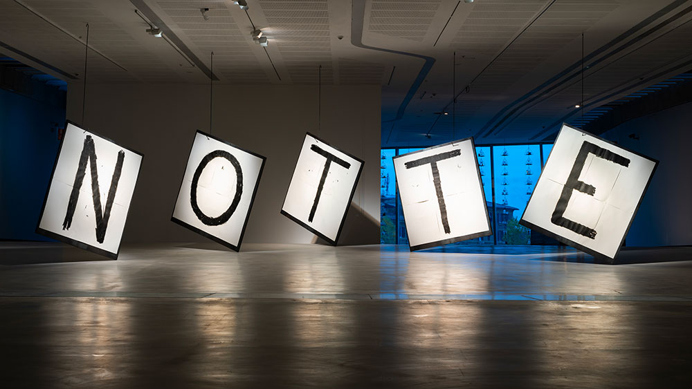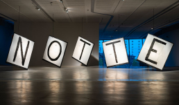 Al centro della galleria 5 l’opera Senza titolo (Notte), riprendendo le prime sperimentazioni con l’alfabeto realizzate negli anni Cinquanta, racconta di un distanziamento dell’artista da ogni tipo di gerarchia di visione. Le lettere, come arti di un corpo in movimento, oscillano nello spazio chiedendo di essere decifrate e, allo stesso tempo, osservate come puri segni.