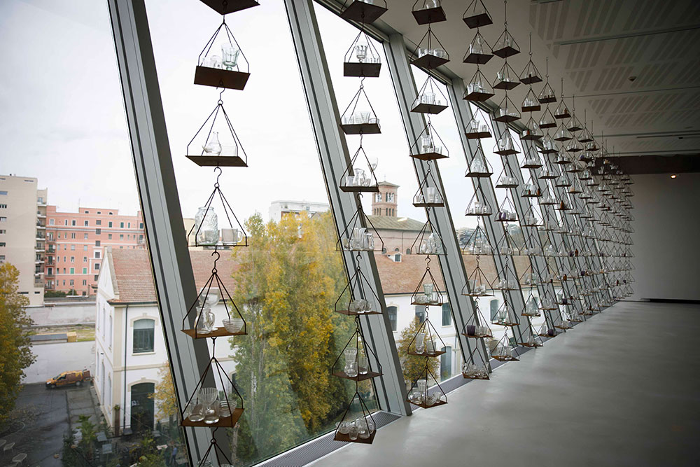 A chiusura del percorso un riallestimento dell’opera concepita dall’artista per il chiostro di San Lazzaro degli Armeni a Venezia – in testata – gioca sulla tensione fra i materiali: come una quinta teatrale rimane sospesa a indicare un passaggio e una tensione fra il dentro e il fuori del museo.