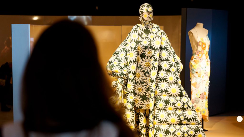 Mostra di moda con un manichino vestito con un abito scenografico completamente decorato con grandi margherite bianche su sfondo verde. L'outfit include una maschera aderente e un voluminoso mantello imbottito con lo stesso motivo floreale. In secondo piano, un altro abito su un manichino, caratterizzato da un design all'uncinetto con fiori colorati. In primo piano, la silhouette sfocata di una persona che osserva l'esposizione