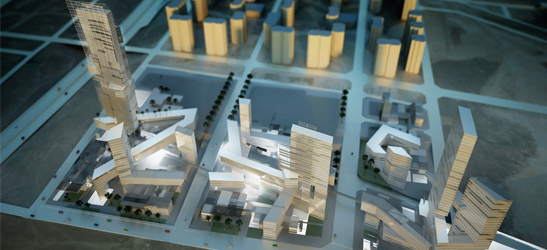 Disegno architettonico a sezione trasversale di un edificio complesso, caratterizzato da linee geometriche, colori vivaci e dettagli strutturali. L'elaborato mostra aree verdi, elementi urbani e spazi interni, con una grande fontana centrale e una torre che si sviluppa in altezza