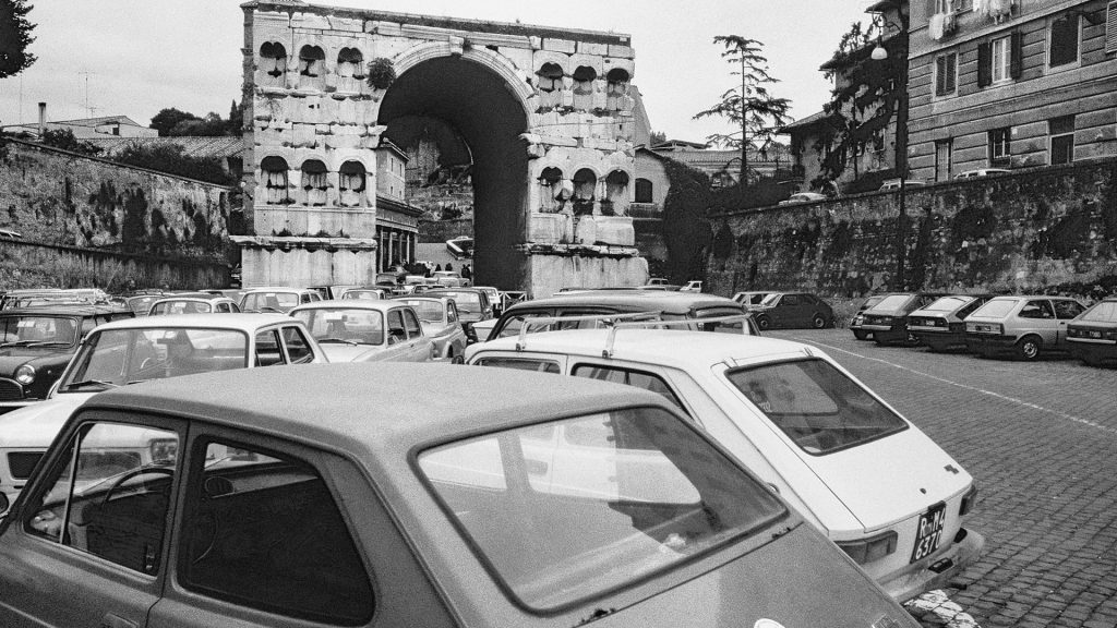 Un tempo Roma era tutta raggiungibile in auto, come se la città fosse un’immensa distesa, aperta e disponibile. Si poteva parcheggiare ovunque e le piazze erano spazi d’uso quotidiano, luoghi attraversati e occupati.