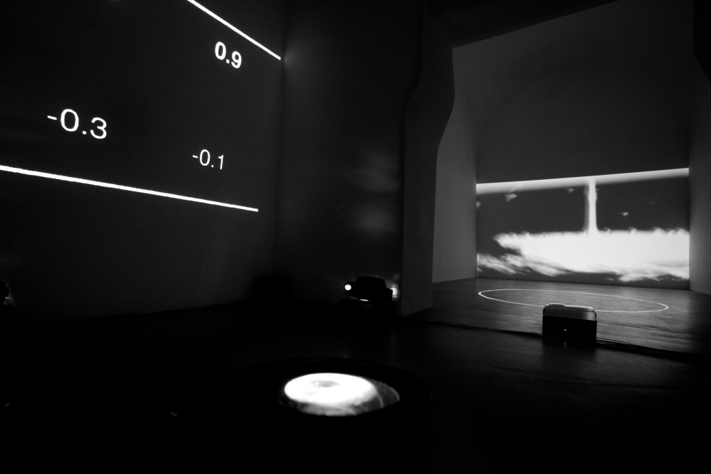 Soundings è un lavoro nato dalla collaborazione tra i due artisti iniziata nel 2013, un’installazione visiva e sonora che cambia in undici secondi. Il termine ha un doppio significato: “fondali” e “misurazioni del mare”, ma anche “cassa armonica” e “sonorità”.
