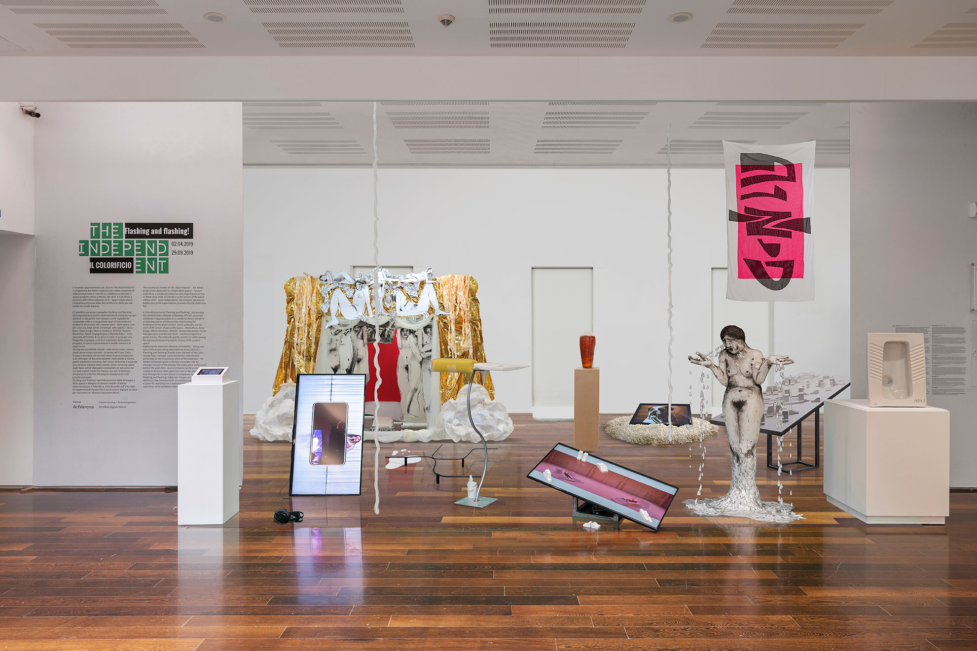 Sul wall dedicato al progetto Il Colorificio presenta Flashing and flashing!: sette opere, una per ciascuno degli artisti presentati nello spazio – Daria Blum, Deniz Eroglu, Marco Giordano, IOCOSE, Tamara MacArthur, Vasilis Papageorgiou e Michele Rizzo –, circoscritte all’interno di un green screen.