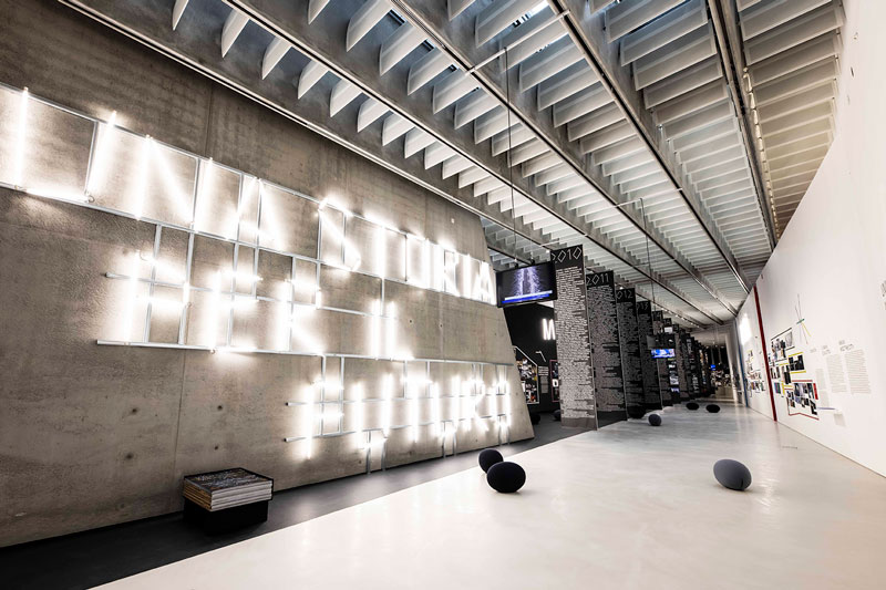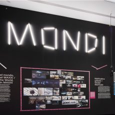 Città, piazza, mondi, realtà, credo sono i neon che spiccano all’interno della galleria, rimandando ai cinque grandi temi della mostra e creando un Atlante che racconta la programmazione del Museo in relazione agli eventi mondiali.