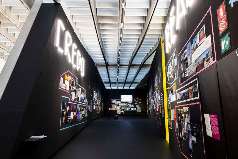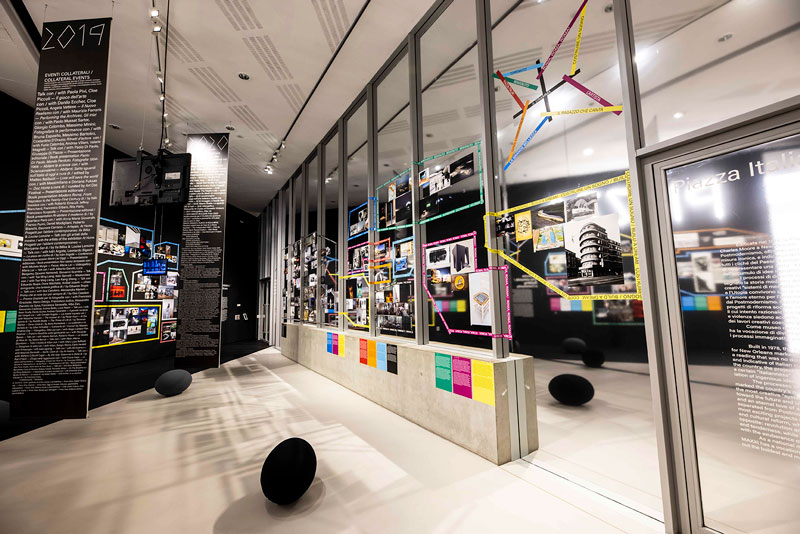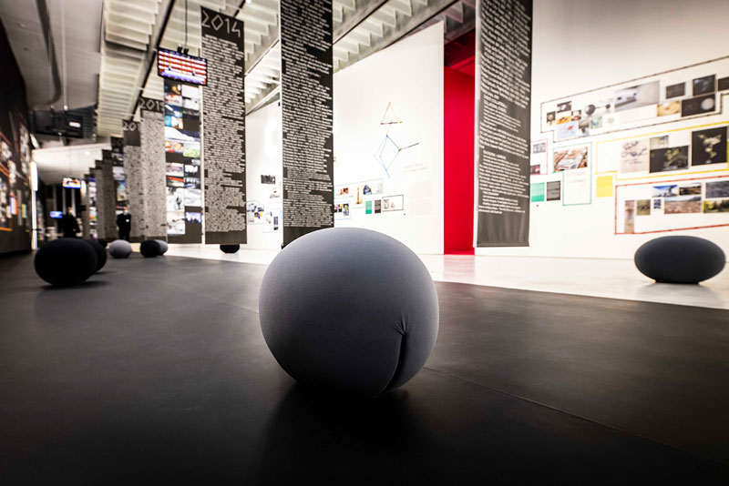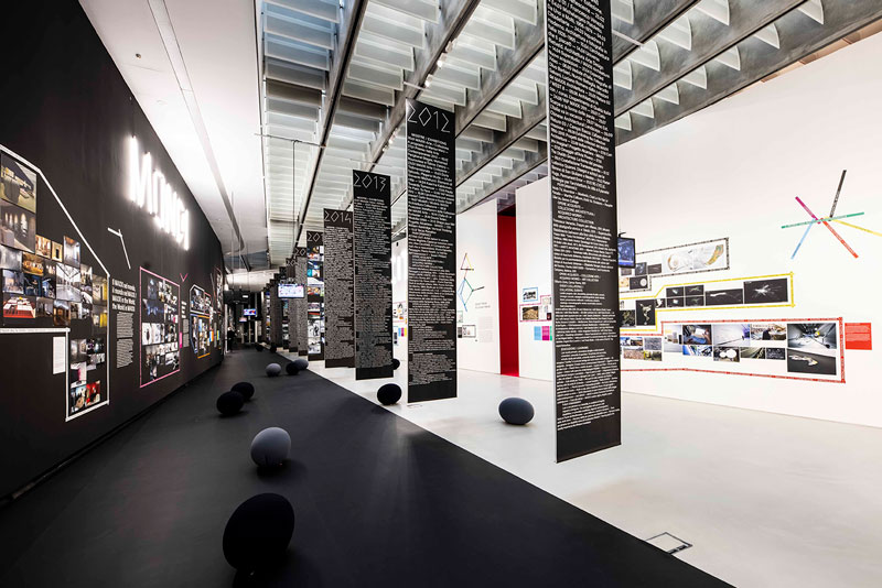 Ne emerge un profondo legame tra la creazione artistica e la realtà contemporanea, sottolineato anche dalla collaborazione con l’Agenzia ANSA, che ha contribuito alla realizzazione di un potente racconto per immagini dei principali fatti del decennio. La missione di organizzare nello spazio questa esplosione di idee e stimoli è stata affidata al celebre studio olandese Inside Outside di Petra Blaisse.