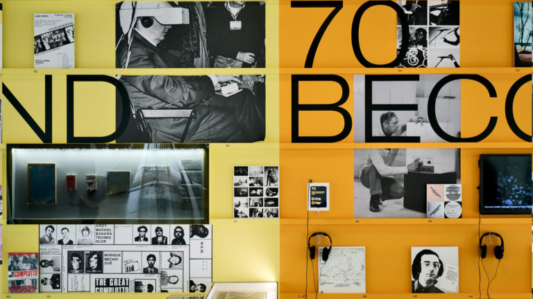 Dalle opere dei grandi padri della sperimentazione sonora degli anni Sessanta, Luciano Berio e Bruno Maderna, agli happening ispirati da Fluxus, John Cage e il Gruppo Gitai; dalle poesie sonore di Maurizio Nannucci agli ambienti audiovisivi di Ugo la Pietra e del Gruppo T; e ancora le sperimentazioni e i primi festival degli anni Settanta, il Punk e Carmelo Bene, la diffusione dei computer e le prime opere d’arte interattiva degli anni Ottanta fino ad arrivare ai giorni nostri con collaborazioni eccellenti come quella tra Mimmo Paladino e Brian Eno. Tutto questo per raccontare la sperimentazione sonora in Italia dal 1950 al 2000, in un percorso ospitato nella hall del museo nello spazio dedicato agli archivi.