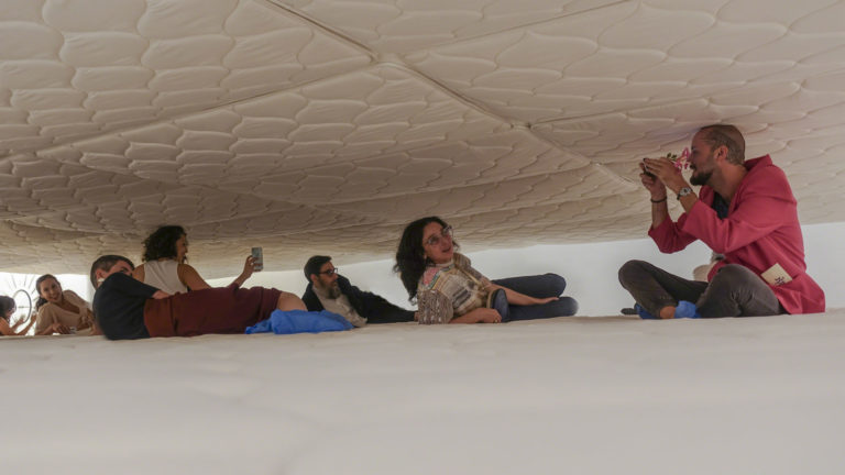 Una gigantesca distesa di materassi che copre più di cento metri quadrati, sovrastata da un’altra, identica ma capovolta, per creare un antro ovattato, uno spazio sottile di gioco o meditazione in cui il pubblico è invitato ad arrampicarsi ed entrare.